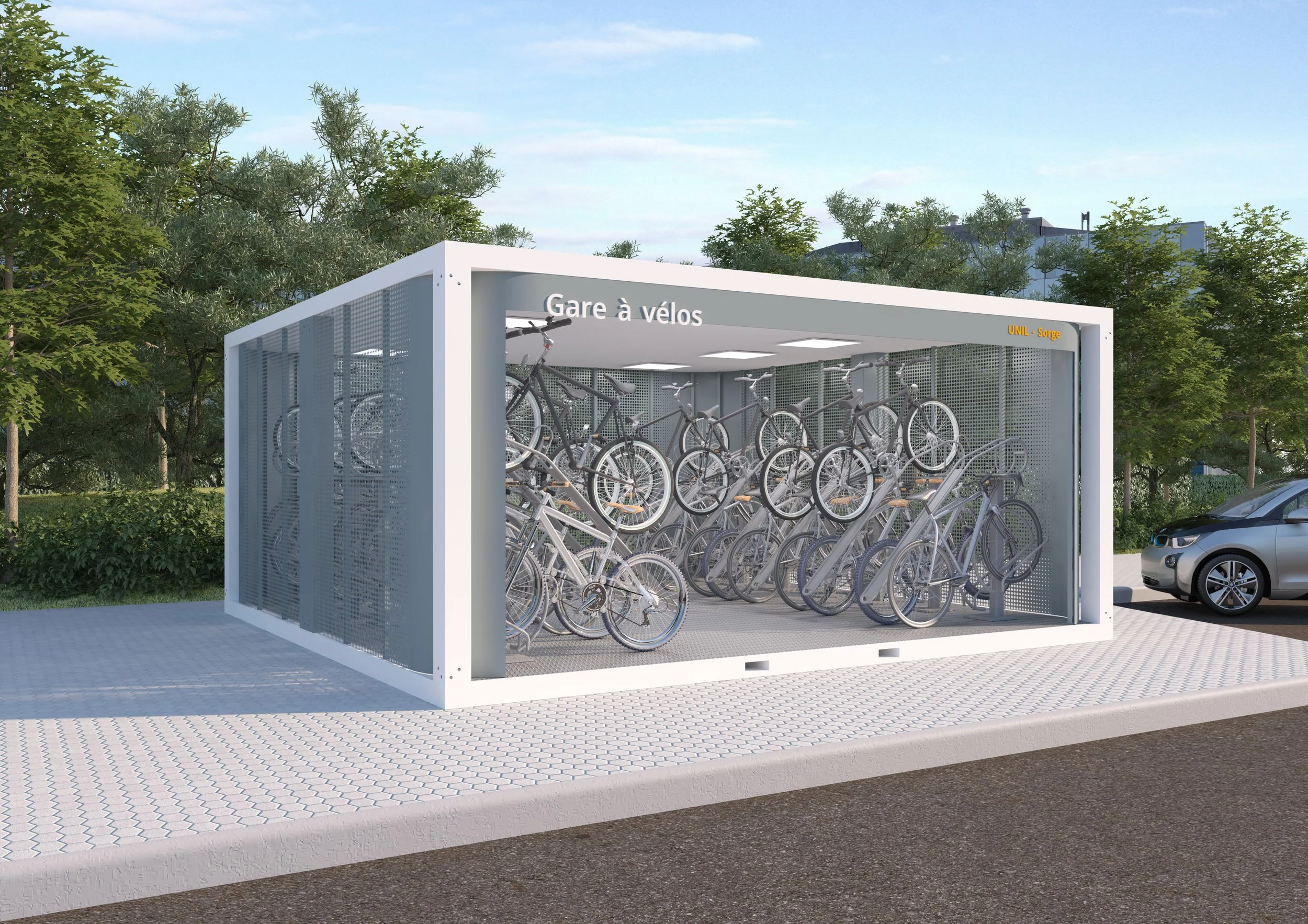 L’aménagement intérieur peut également être modulé à votre guise. Choisissez le type et la quantité de supports à vélo, le nombre de casiers, le nombre de bornes de recharge tout en choisissant les couleurs et finitions de vos équipements. Libérez votre créativité et nous vous fournirons une visualisation de votre prochaine vélostation.