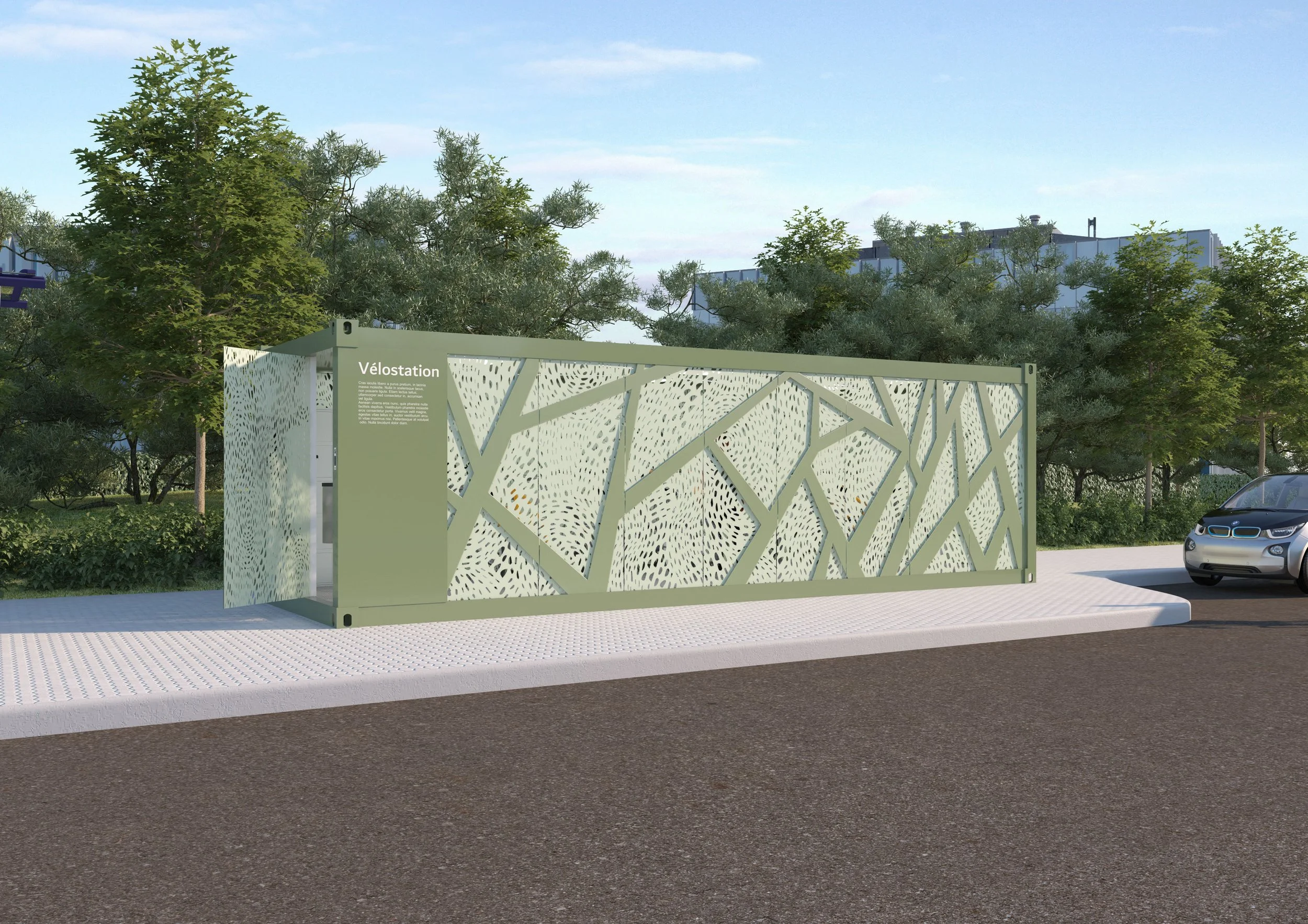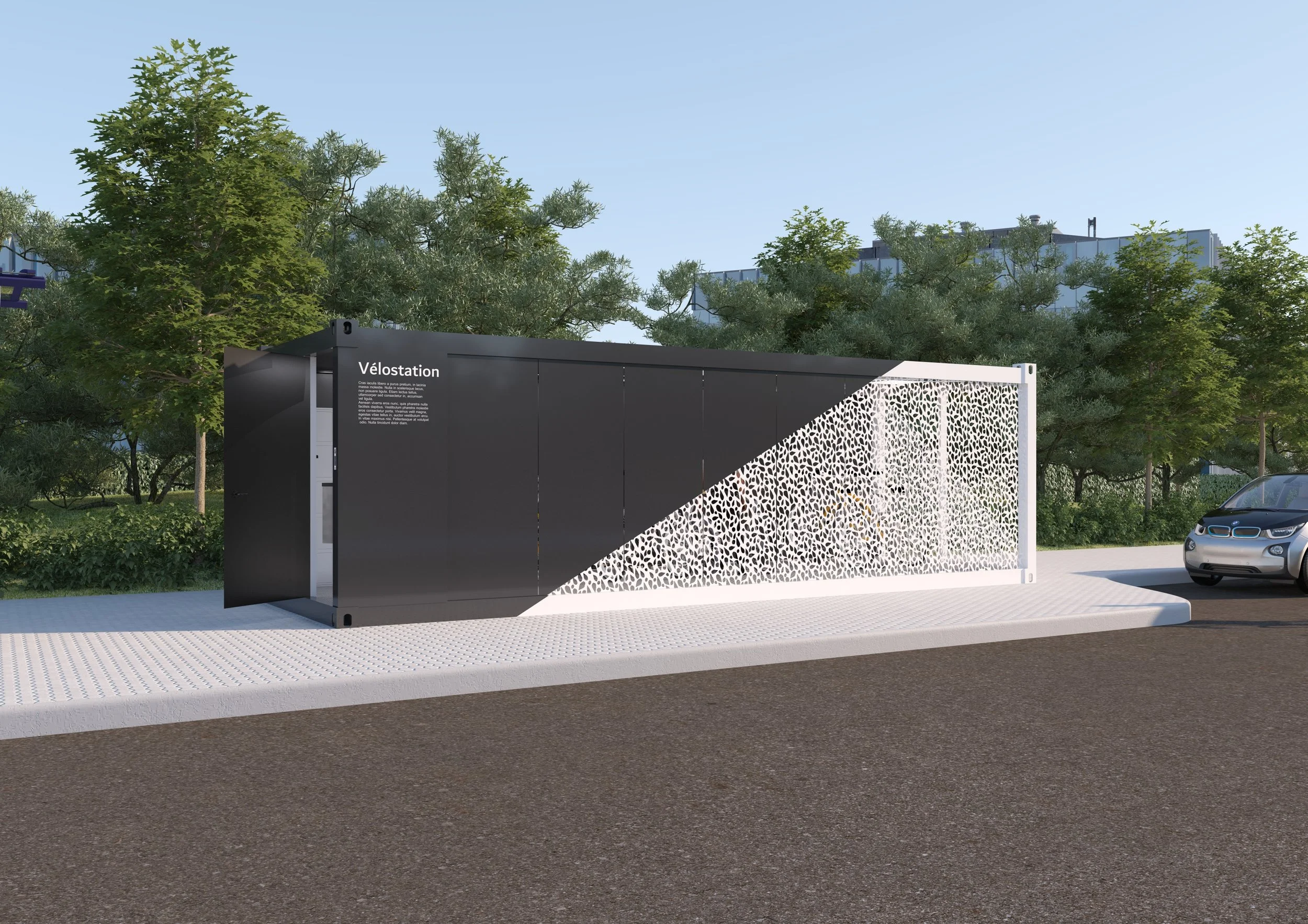 Kameleon Urban peut être complètement personnalisé. Choisissez le motif des perforations en façade pour y intégrer du texte, un logo, une image ou encore des formes géométriques. Choisissez également les couleurs de votre vélostation afin qu’elle s’intègre parfaitement dans votre projet.